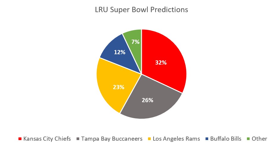 Twenty-six respondents chose the Tampa Bay Buccaneers to win Super Bowl LVI. Twenty-three selected the Los Angeles Rams, 12 picked the Buffalo Bills, and seven opted in with other. Teams that respondents wrote for other include two votes for the Pittsburgh Steelers and one for each of the following: