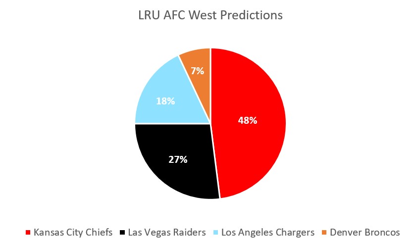 Like the AFC and Super Bowl, the Chiefs were favorites to win their division, obtaining 48 selections. Behind them were the Las Vegas Raiders with 27, the Los Angeles Chargers with 18, and the Denver Broncos with seven.