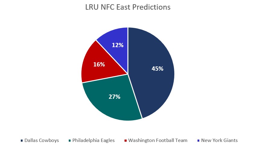 Forty-five survey-takers said they like America’s Team in the NFC East. Twenty-seven percent chose the Philadelphia Eagles, 16 percent selected the Washington Football Team, and 12 percent took the New York Giants.