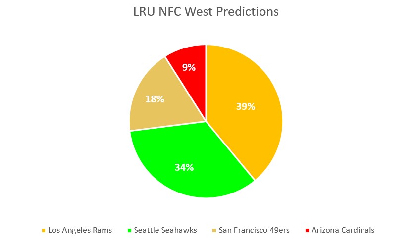 The NFC favorite Rams were also favorites in their division, totaling 39 votes. The Seattle Seahawks were close behind with 34 and the San Francisco 49ers snagged 18. The Arizona Cardinals—the only undefeated team remaining—secured nine votes.