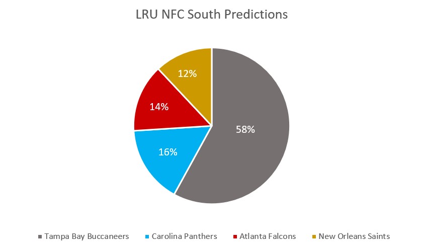 The Saints won the South last year, but La Roche chose them least, giving them 12 nominations. Tom Brady and company earned the most votes, the Buccaneers finishing with 58. In the middle were the Carolina Panthers and Atlanta Falcons, earning 16 and 14 separately.