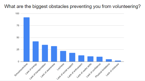 Ninety-two percent of survey-takers said that work, school, and other time commitments prevent them from volunteering. Participants chose up to three options from a varied list. Lack of energy, lack of transportation, and lack of awareness were other common responses.