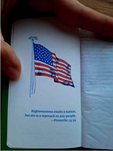 The Bibles contain one graphic, an American flag. Under the simple sketch of the flag reads Proverbs 14:34, “Righteousness exalts a nation, but sin is a reproach to any people.” The image is stuck with the reader as they flip through the thin pages. In the beginning of the small Bibles are placed “God’s Help in Crisis” and “Help With Life’s Problems,” followed by headings and page numbers. Some of the headings include “Abortion” and “Future?”