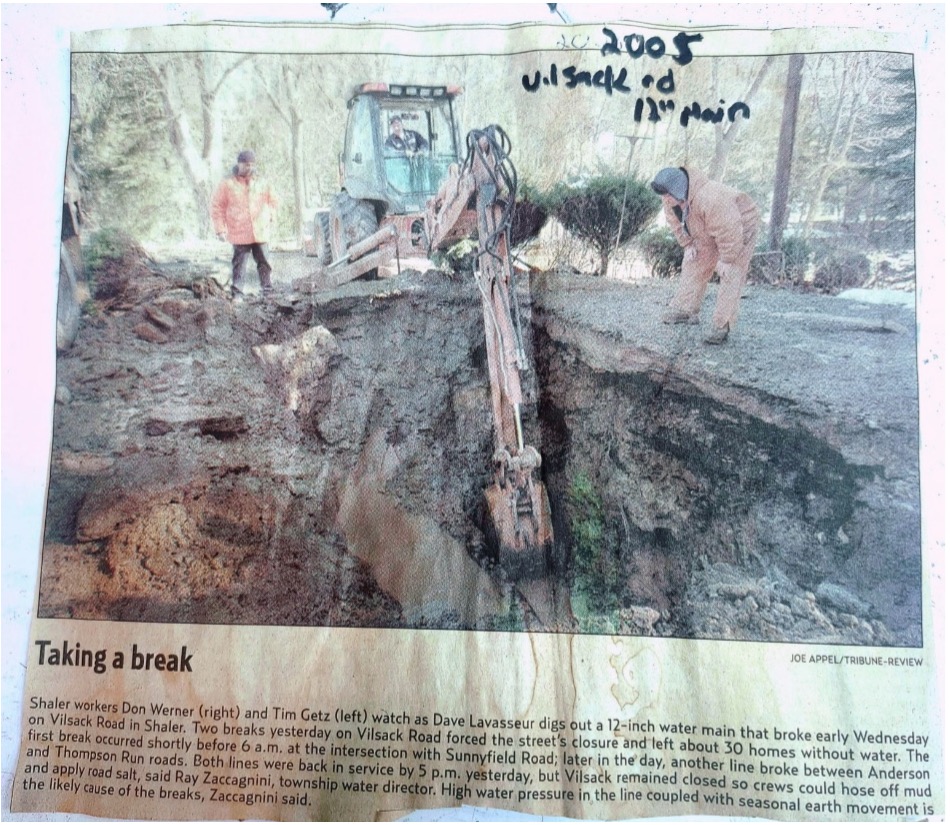A: “It was about 22 years ago that I was applying for the township. At the time, Shaler Water and Shaler Township were hand-in-hand. If you worked for the township, you’d be subbed out for the water and back and forth. I got my foot in the door reading meters, then I started doing water breaks. Read meters all day, water break all night.