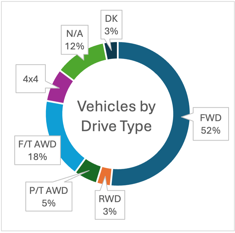 74 percent of respondents said that they drive either a sedan or SUV and over half said that they had a front-wheel drive vehicle. 24 percent said that they have part-time or full-time AWD. Two respondents reported having two different vehicles that they drove regularly, and three were unsure of what drive type they had.