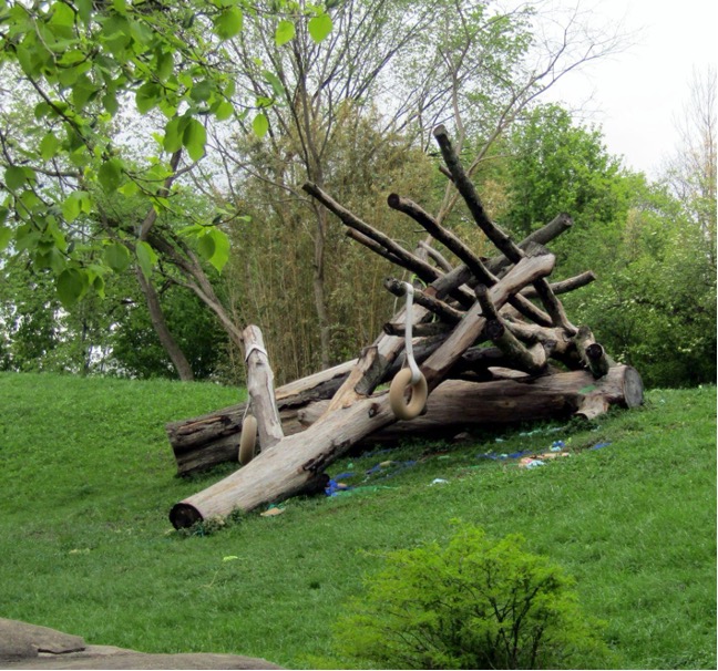 A fallen tree reused as a play structure within the gorilla enclosure.