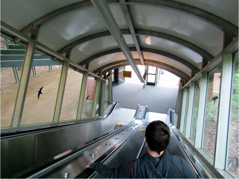 La Roche student, Matthew Marrs, going down the Pittsburgh Zoo and Aquarium escalator.