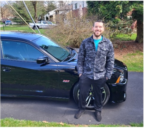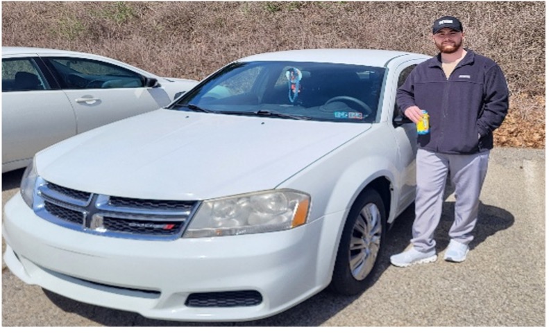 La Roche University senior Jake Speicher, age 26, drives a white 2013 Dodge Avenger that he bought from an army buddy in Georgia in 2020. Jake said that, initially, he just needed a way to get back to Pittsburgh after leaving the U.S. Army.